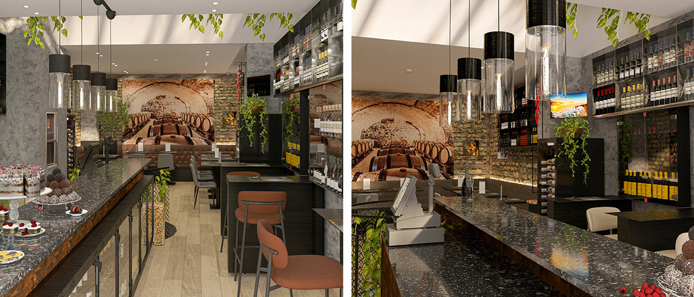 Outcome: A functional and inviting wine bar with efficient use of space and a cohesive design aesthetic