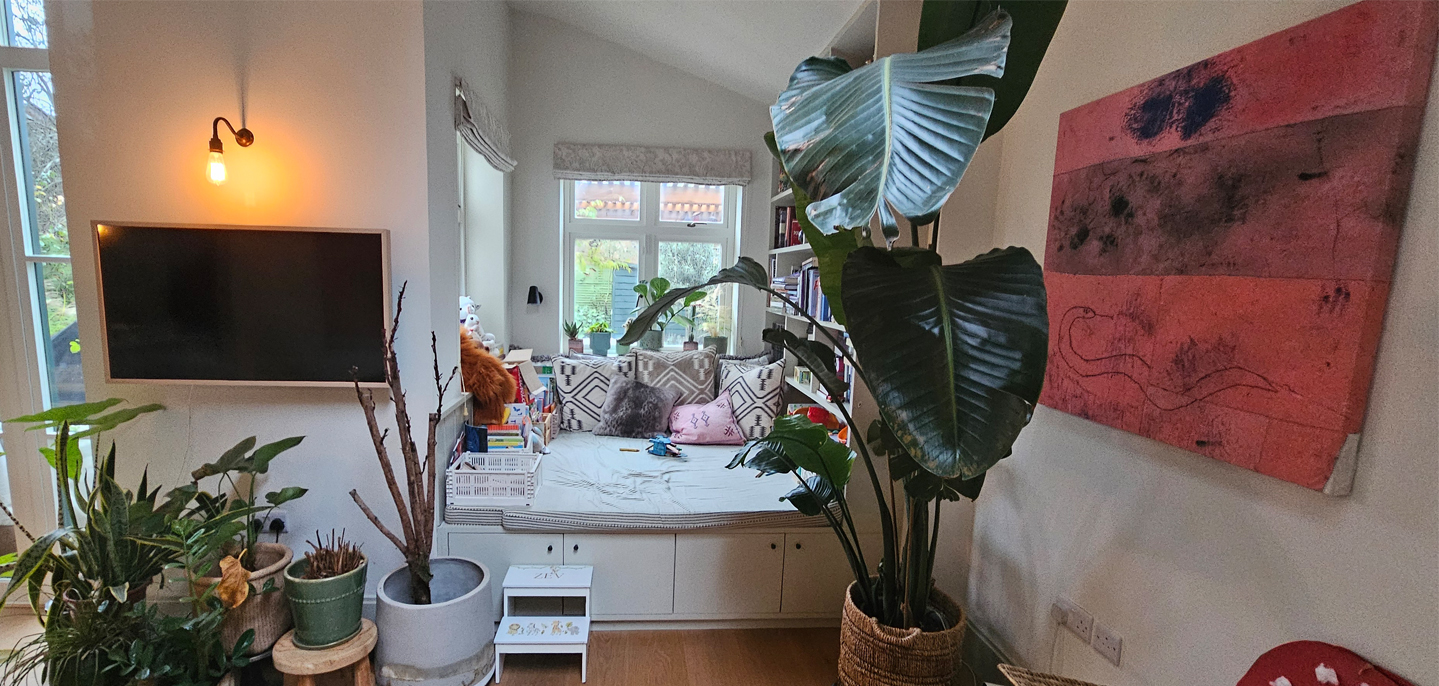 In this project, the client approached us to design a rear extension. The main challenge was to create a dedicated playroom for children, featuring a skylight and large glass doors opening onto the garden. In the transitional space between the new kids' room and the main house, the client asked us to design a cosy reading area and to expand the existing bookshelf while keeping the same style. We developed several design solutions before finding the one that met all the client's needs, while maintaining a fresh, innovative, and youthful aesthetic—maximising every inch of available space. We also planned for the reuse of part of the existing outdoor paving to create a path around the new extension.