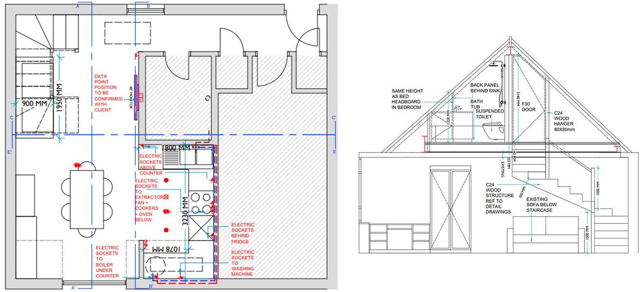 We recently completed a challenging Loft Conversion Project that required creative problem-solving. Our main task was to create a new bedroom and en-suite bathroom within the existing roofline, which presented significant space constraints. This project involved detailed planning, including the creation of precise construction drawings and careful consideration of plumbing and electrical requirements. We worked closely with builders throughout the process to ensure smooth execution. Despite the challenges, we successfully connected the new loft space to the existing house via staircases, resulting in a custom-designed loft that blends seamlessly with the original structure while maximizing functionality. Additionally, the client took this opportunity to update their kitchen on the floor below, which included removing a wall to create an open-plan living area.
