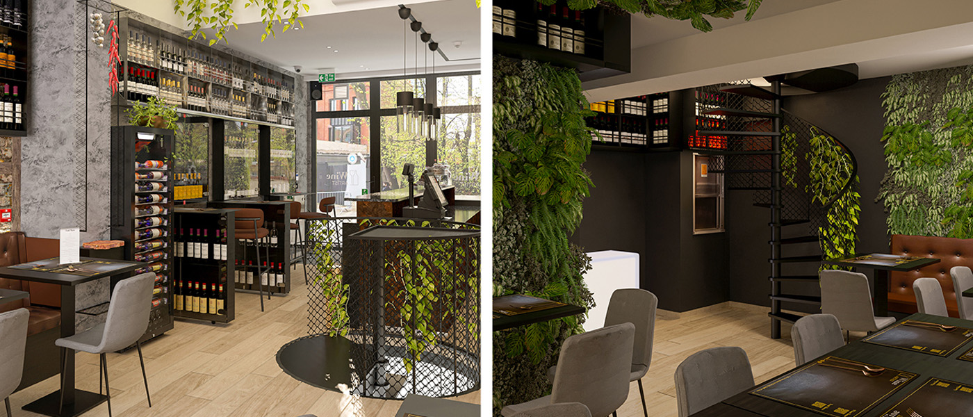 This project involved the redesign of a wine bar's ground floor and basement in North London, focusing on maximizing the use of limited space. The client requested the integration of new elements, including rotating tables and stools, to enhance functionality. The design primarily incorporated cast iron and other metal elements, aligning with the client's ownership of a metal fabrication facility. The existing cast iron staircase was seamlessly integrated with the new design elements. In the basement, artificial plants were introduced to create a welcoming and inclusive atmosphere.